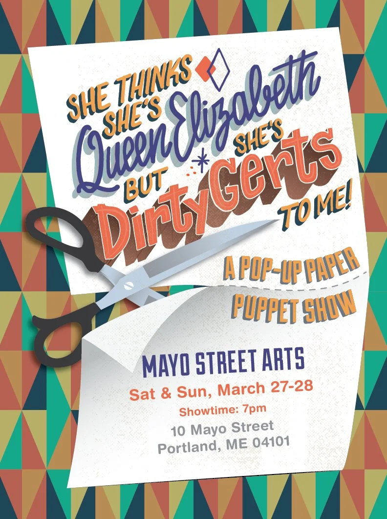 Mayo Street Arts will present PuppetKabob’s Dirty Gerts, a pop-up puppet show created entirely from repurposed paper materials. The performance follows a young middle schooler navigating creativity, acceptance, and the challenges of fitting in, drawing on 1960s pop culture and historical fiction. Each performance will include a Q&A with the artists, and PuppetKabob’s Sarah Frechette will lead workshops on pop-up puppet theater and paper sculpture at the University of Southern Maine and the Maine College of Art & Design.